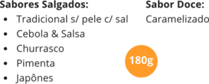 Sabores disponíveis: Tradicional sem pele com sal, Cebola & Salsa, Churrasco, Pimenta, Japonês e Caramelizado. Embalagem disponível: